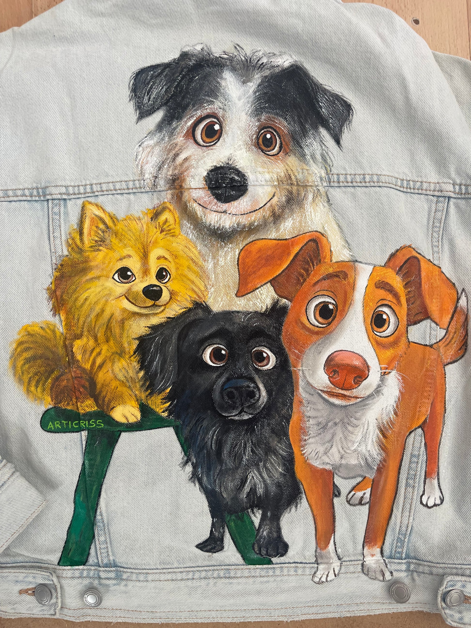 Convierte a tus mascotas en un personajes animados únicos y llévala siempre contigo con esta exclusiva cazadora vaquera pintada a mano. Cada diseño es creado desde cero a partir de la foto que tú elijas, transformando a tu perro o gato en una ilustración animada llena de color, personalidad y encanto.