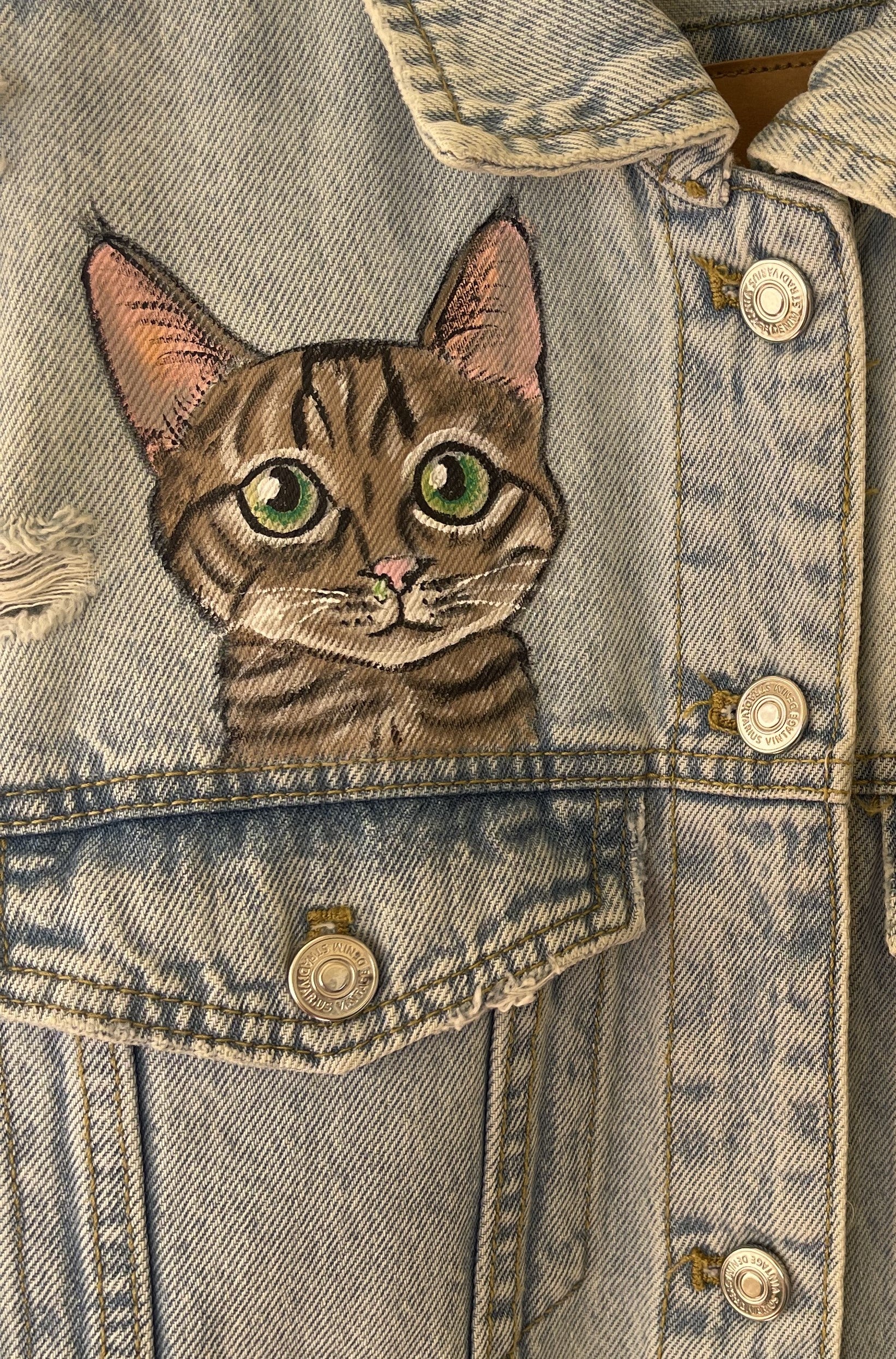 Convierte a tu mascota en un personaje animado único y llévala siempre contigo con esta exclusiva cazadora vaquera pintada a mano. Cada diseño es creado desde cero a partir de la foto que tú elijas, transformando a tu perro o gato en una ilustración animada llena de color, personalidad y encanto.